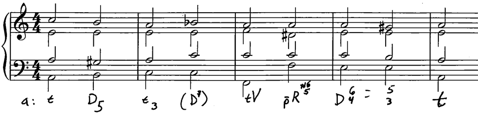 The above example shows a pR with added raised 6 in addition to 5 (measure 3). These chords are aurally recognizable by le (low 6) in the bass and fi (#4) elsewhere in the chord. There are 3 variations of this: pR#6 (le-do-fi -only 3 notes), pR#6/5 (le-do-me-fi), and pR#6/4 (le-do-re-fi).* All of these chords resolve to Dominant.
