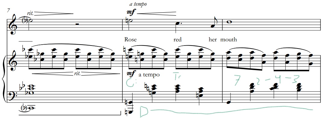 After our C flat excursion, we go straight back to C major harmonies. This helps highlight the text because of the sudden change. Also, this text metaphor “Rose red her mouth” seems more standard to me, so standard harmony.