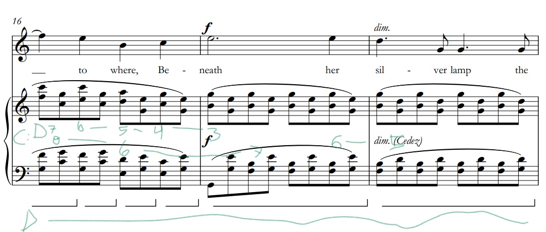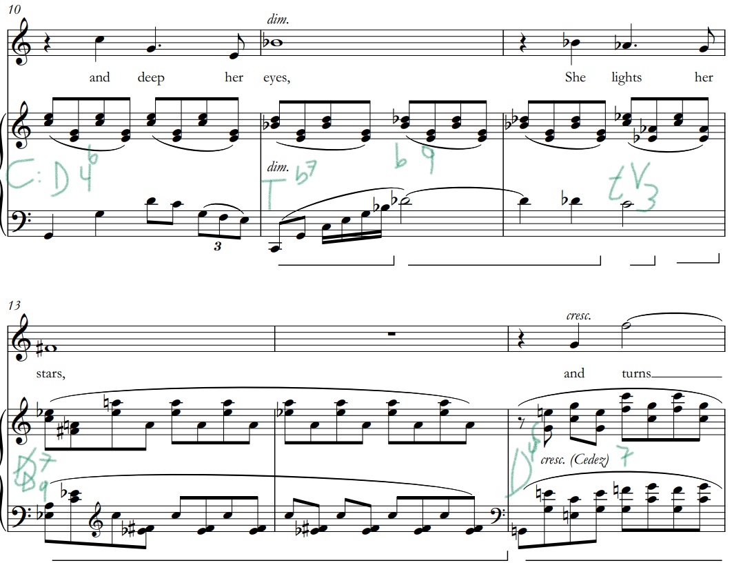 Measures 13-14 give us a very tension building tonicization of the Dominant (missing the root, ninth in the bass), which resolves to (what seems to be standard for this piece) Dominant with 6/4 replacing 5/3. The chromaticism here helps mirror the distance of the stars, and the bass line in the piano literally goes “deep” for some text painting in m. 11.