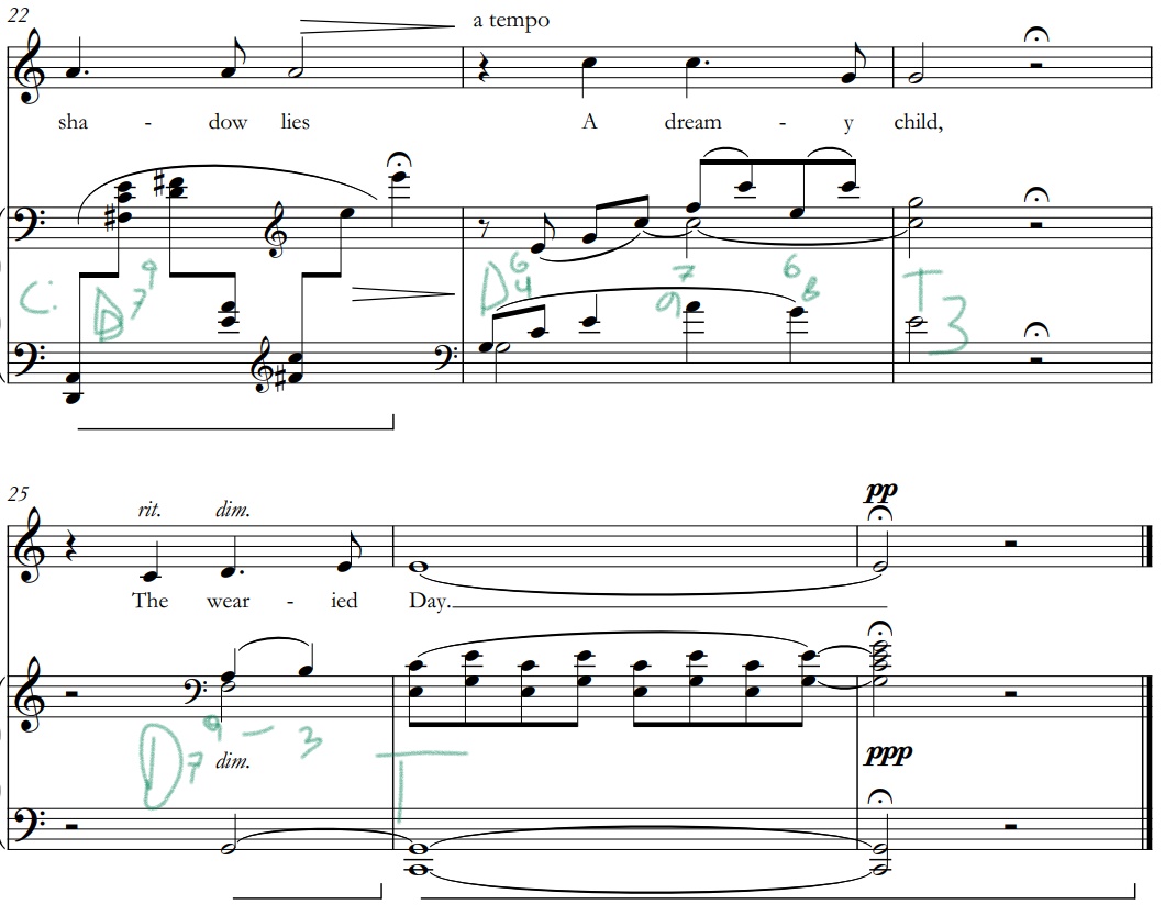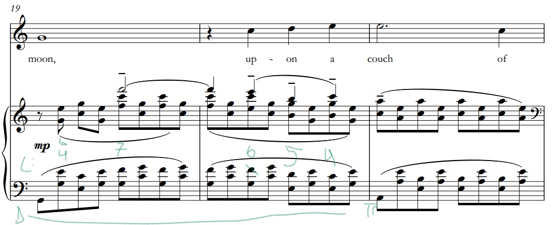 The vocal line descends into “shadow lies” as if to lie down, but the piano line is rising. The rising motion moves toward and underlies the word “dreamy” and helps continue the motion towards the cadence.