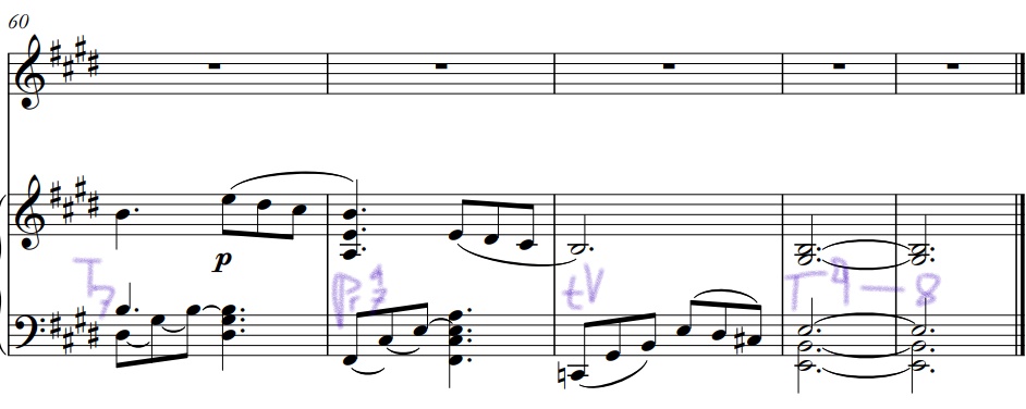 The piano coda is an interesting version of a plagal cadential tag, using a Predominant relative and a borrowed chord from e minor, the C major chord in m. 62. I labeled this as a tonic Variant, but it could also be a predominant Relative, if we see it as the major relative of the a minor predominant from e minor. I think the pR is a better label (oops), emphasizing the predominant motion for the plagal tag, and then reserving tonic for the last chord (with a 9-8 suspension, I have a misprint, the third note from the bass in m. 63 is supposed to be F#).