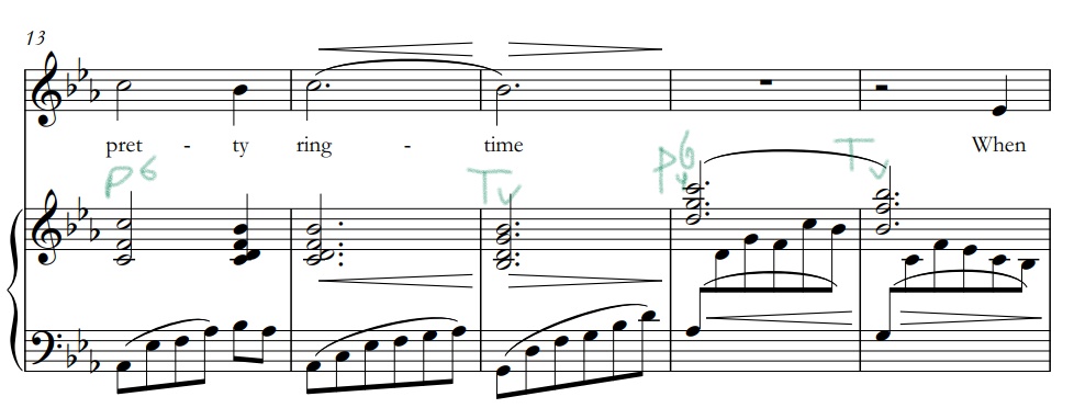 Similar to the opening, the next several bars are a tonic expansion. Here I’ve added notes on which extra notes are above the tonic pedal in mm 10-11, and m 12 moves to a Tonic variant as the song shifts away from the establishment of the tonic.